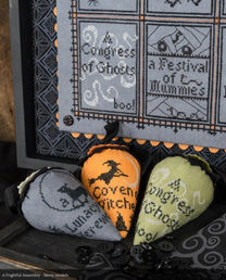 A FRIGHTFUL ASSEMBLY, Copyright 2024. Original counted thread designs by Linda Stolz for Erica Michaels Designs.