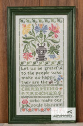 Marcel Proust’s verse inspires this colorful welcome to springtime and a nod to those who make our lives special. The verse is complimented by floral motifs from 19th century pattern books, and I just couldn’t resist stitching that exuberant bouquet on silk gauze, showing that portion as an alternate to the larger sampler. A pretty berry is also included, shown on still another fabric, illustrating the multiple options available - so choose your favorite!