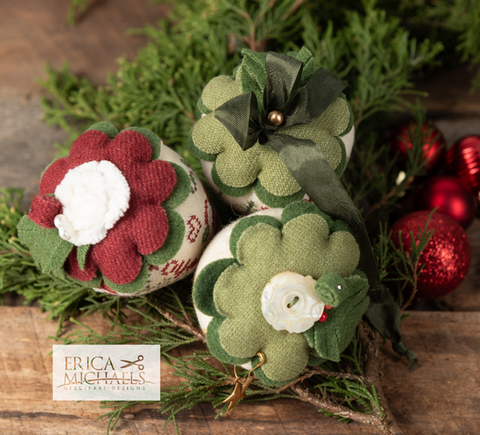 These are topped with lovely wools, and little accents for each; the same overall color scheme for the tops is accented with varied details. So many possibilities for these top treatments!